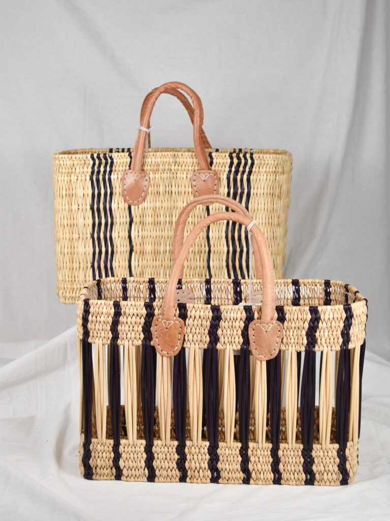 Die Korbtaschen bestehen aus robusten Naturfasern, die sorgfältig von Hand geerntet und getrocknet werden. Auf traditionellen Handwebrahmen verarbeitet, verleihen diese Materialien den Taschen ihre außergewöhnliche Stärke und Langlebigkeit. Die Ledergriffe, die in Marrakesch an die Taschen angebracht werden, sorgen für zusätzlichen Komfort und Halt.