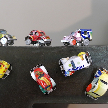 Auto-Magnete aus Recyclingmaterial, bunt gestaltet mit afrikanischen Mustern.